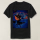 Halloween witch art of witch riding her broom with orange Halloween moon and black cat and text. Dark blue sky background on black shirt.