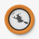 Halloween flying witch and black cat on royal orange and white Paper Plate. Halloween text can be personalized.