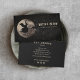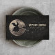 Silhouette illustration of a witch riding a broom and vampire bat in front of gold moon