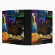 A magical brown chocolate coloured cat wearing a purple witch hart sitting on books. Cauldron, pumpkins, potions, and wand sit amongst the cat.