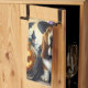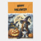 Adorable picture of a dog dressed as a witch, with bats and pumpkins, is featured on this kitchen towel for Halloween. Message on towel reads, "Happy Halloween", great way to decorate for the holiday! A trivet and hot pad are also available in the same design.