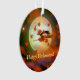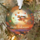Hanging ornament with my original artwork of the silhouette of a witch flying past a spooky full moon on Halloween night, stirring up the autumn leaves. Customizable text says "Happy Halloween".