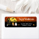 This fun and spooky address label features a cute witch and ghost beside a crooked haunted house. In the background is a full moon with bats and an orange night sky with stars. The text combines decorative and serif fonts for a stylish and modern look. This is perfect for Halloween.
