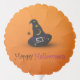 Happy Halloween illustration featuring a witch hat with golden stars and moon and a hanging spider on an orange background with jack-o-lantern pattern shapes.