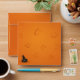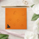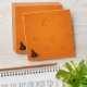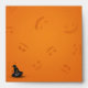 Happy Halloween illustration featuring a witch hat with golden stars and moon and a hanging spider on an orange background with jack-o-lantern pattern shapes.