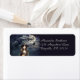 A pretty Halloween witch in a black hat and dress holds a small jack o’ lantern while a raven looks on from a tree branch. A huge colony of bats flies across a full moon in the night sky above her.