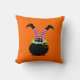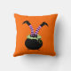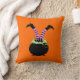 This pillow features a black pot of green witch's brew with witch legs upside down in to pot. The legs are a colorful purple with black stripes. The background of the pillow is a dark orange.