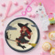 A happy red headed witch rides on her broomstick with her famliar cat on a moonlit night