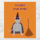 This awesome sheet of wine bottle labels features a digital art image of a cute gray rat witch with pink ears, nose, feet and tail. The rat is wearing a black pointed hat with a gold buckle and purple stars all over it. The rats is also wearing a black cloak also covered in purple stars. Next to the rat is a brown broom made of twigs. This rat is dressed up ready for a Halloween party. There is custom text so you can include a message.