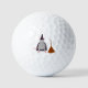 This awesome golf ball features a digital art image of a cute gray rat witch with pink ears, nose, feet and tail. The rat is wearing a black pointed hat with a gold buckle and purple stars all over it. The rats is also wearing a black cloak also covered in purple stars. Next to the rat is a brown broom made of twigs. This rat is dressed up ready for a Halloween party.