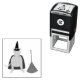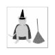 This awesome self inking stamp features a digital art image of a cute gray rat witch with pink ears, nose, feet and tail. The rat is wearing a black pointed hat with a gold buckle and purple stars all over it. The rats is also wearing a black cloak also covered in purple stars. Next to the rat is a brown broom made of twigs. This rat is dressed up ready for a Halloween party.