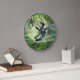 A green Halloween holiday graphic design of a full moon and a silhouette of a witch flying in front of it. A spider is dropping down and there are webs in the corners.. A black Roman numeral clock face was added to create a unique gift for your home or office.