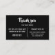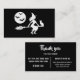 Small business thank you for your order card design featuring Destei's minimalist Halloween silhouette design of a long hair witch woman flying on a broomstick. The witch is wearing a long dress, high heel shoes and a witch's hat. The moon is shining behind the witch and there are three bats flying over it. A cat sits on the front of the broomstick. On the other side there are multiple personalizable text areas.