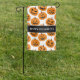 This Halloween yard flag is shown in the outdoor style with a festive pumpkins print.