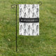 This Halloween yard flag is shown in the outdoor style with a festive dancing skeletons print.