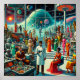 A vintage-futuristic illustration of strange and beautiful figures waiting for something interesting to happen in their universe. The vivid colors, bold energy, and vintage theme pay tribute to the thrilling imagination of midcentury book covers and movie posters.