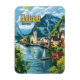 A picturesque and nostalgic portrayal of Hallstatt, Austria, renowned for its stunning alpine scenery, historic charm, and picturesque lakeside setting. The design captures the village's iconic pastel-colored houses reflected in the tranquil waters of Hallstätter See (Lake Hallstatt), surrounded by towering mountains. Rendered in a vintage style, the artwork evokes the serene beauty and timeless allure of Hallstatt, inviting viewers to experience its idyllic landscapes and rich cultural heritage.