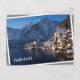 Photo postcard of the town of Hallstatt covered in snow at the lakeside of the Hallstätter See lake with Alps mountains in the background in the first light of the sunrise in a winter landscape in Austria with a white edge and in white the text 'Hallstatt'. The image is a bit rotated to create the illusion of it laying loose.