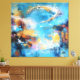 A luminous ring of motion drifts through layered blues, golds, and softened whites, evoking the meeting point of sky and water. Textured strokes and cascading marks create a sense of suspended energy—both turbulent and serene—while warm accents ignite the cool field beneath. Halo of Tides invites contemplation of balance and passage, capturing a moment where movement gathers into calm before dispersing again.