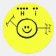 This is "Hi" in morse code on a bright yellow sticker, along with our Happy Ham logo. This does not fit on all sticker shapes! So, If you'd like this image on another sticker shape, write me, and I'll make one so that it fits inside correctly. It was impossible to line this up for all the shapes. You can customize this at the bottom with a name, call sign, club name, GREETER, Hello!, or anything else you want to say. Do do that, just click the "Customize" and then "Add Text." Write in what you want. Use the + and - buttons to size. Use the arrows to position. Or click the "design" button at top left and use your mouse to move. Change fonts by clicking the "F" button and change colors by clicking the black square. Both will produce drop down menus with more options.