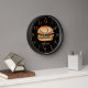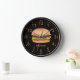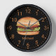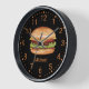 Destei's pattern of illustrated hamburgers that have sesame seed buns filled with cheese, lettuce, beef, tomato, ketchup and pickles. The clockface is made of orange color numbers and the minutes and hours are shown with circles. The background color is black, but it can be changed to any other color, if so wished. There is also a personalizable text area for a name or other custom text.