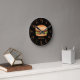 Destei's pattern of illustrated hamburgers that have sesame seed buns filled with cheese, lettuce, beef, tomato, ketchup and pickles. The clockface is made of orange color numbers and the minutes and hours are shown with circles. The background color is black, but it can be changed to any other color, if so wished. There is also a personalizable text area for a name or other custom text.