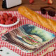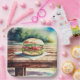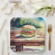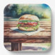 Hamburger on a picnic table so people can put a hamburger on a picnic table. So meta.