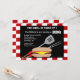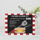 This is the perfect invitation to start that barbecue off right. This invite is set on a black background with red and white checkered border.. There is a hamburger with cooking utensils a spatula and a large fork behind the burger. Adorable for any party! ©cupcakecuties