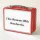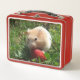 Adorable photo of a hamster eating a strawberry, is featured on this metal lunchbox. Lunchbox is red, with photo of a hamster on the front and a message on the back, "I Love Hammies With Strawberries". A great way to take lunch to school, especially for hamster fans!
