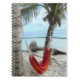 Photograph of a hammock strung between two palms on a Caribbean beach.