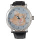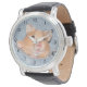Orange hamster face peeking out of blue jeans pocket wrist watch