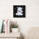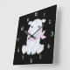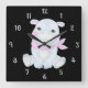 This wall clock displays the body of Hancy The Hippo a baby hippo in the center wearing a pink bandana with pink cheeks in a sitting pose inside of light blue numbers with black background in this animal theme & style. This clock is made for any wall and printed with a AcryliPrint®HD process measures 10.75"x10.75" and made from grade-A acrylic. Battery operated uses one AA battery for Indoor use only, not recommended for outdoor use.