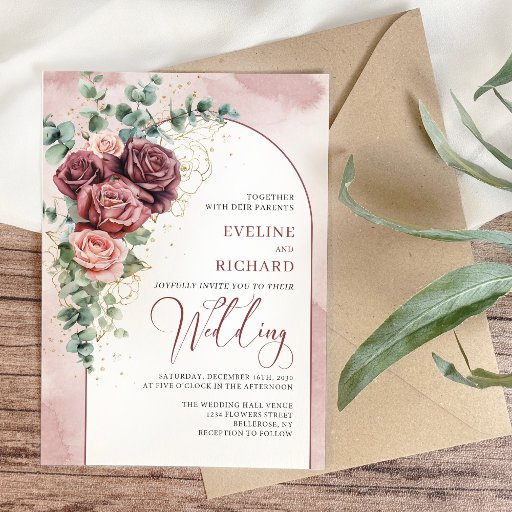 Boho arch blush and burgundy roses and eucalyptus Designed by Violet Pironkova - VP Graphic Design Studio
