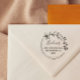 Beautiful address stamp with your name in a thin script and your address in small charming letters inside a simply drawn wreath with a flower, a greenery twig, and a branch of rosehip berries.