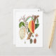 Botanical illustration showing a cocoa pod, leaves and flowers.