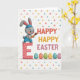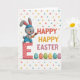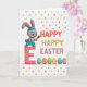 This card shows a cute long-eared bunny perched on a large polka-dotted capital “E,” wearing a sky-blue cap and matching overalls 🐰. Its rosy cheeks and wide smile, along with the way it proudly holds a paintbrush, suggest it’s decorating the scene for someone special, like a friend it can’t wait to surprise. The background stays bright white, sprinkled with small pastel dots in soft coral, sunny yellow, and calm blue for a light spring look 🌷. On the right side, the words “HAPPY HAPPY EASTER” are set in large all-caps letters, stacked neatly and shaded from deep red through warm golden tones into gentle pink. Along the lower area, six decorated egg shapes line up beneath the text, each with different patterns like zigzags, stripes, and dotted accents. The colors on the eggs include shades of blue, green, yellow-orange, and light purple, arranged so they feel like a cheerful little parade. The big “E” sits on the left with scattered dots around it, while the bunny leans forward on top, brush angled upward as if adding one last spot of paint.