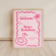 Introducing our "Final Flamingle" all in one Bachelorette downloadable welcome poster, the perfect way to kick off an unforgettable celebration with your closest friends! This stunning poster features a vibrant hot pink hand-drawn squiggle frame that adds a playful touch to the soft pink background. Adorned with whimsical hand-drawn icons of a flamingo pool toy, a refreshing coconut drink, a palm tree and beautiful hibiscus flowers, this welcome poster sets the scene for a tropical and fun-filled weekend.