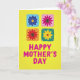 This card features a bright yellow background that feels like sunshine, with four cheerful flowers arranged in a neat 2x2 grid near the top, like little keepsakes set side by side. Each blossom sits inside its own softly tinted square—one deep blue, one hot pink, one rich red, and one golden yellow—creating a cozy, friendly contrast that reads like a warm hug ❤️. The squares have a lightly rough, painted texture, and each corner shows small contrasting marks that resemble pins or stitched tabs, adding a homey, caring touch. Beneath the flower grid, the words “HAPPY MOTHER’S DAY” appear centered and large in magenta, with letters that look slightly worn, like ink pressed onto paper. The text sits in the lower half with plenty of open space around it, so the message feels clear and easy to read. The flat, graphic lighting keeps everything crisp, while the bright color pairing gives the flowers an affectionate, almost gift-like presence 🌼. In the upper section, four pastel-framed flower panels sit evenly aligned, each secured by tiny corner details that look like little fasteners.