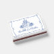 European Inspired Blue and White Horizontal Wedding Matchbox Favors. These charming matchboxes feature a clean, horizontal layout with a crisp white background and classic blue artwork for a timeless European feel. The design is intentionally minimal, showcasing only a delicate hand-drawn blue frame around the edge, a detailed illustration of a dining table centered within the layout, and the couple’s names displayed in coordinating blue lettering.