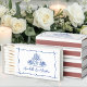 The simple combination of the frame, table illustration, and names creates a refined and balanced look that feels both playful and elegant without overwhelming the small format. Inspired by classic Italian and French blue and white aesthetics, this understated design makes a stylish keepsake for weddings, rehearsal dinners, or engagement celebrations.