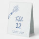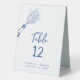 Hand Drawn Illustrated Numbered Cobalt Blue Wedding Table Tent Sign... A whimsical hand drawn illustration of bubbly wine spraying from a bottle borders the text on your wedding table number signs with your table number and bride and groom names and wedding date in hand-written script and sans serif typography just below. All text on both sides of the sign can be easily revised on the personalization template.