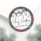 Festive Holiday Round Sticker. This cheerful round sticker features a doodle swag of pine greenery and hanging ornaments along the top, with scattered star doodles adding a playful touch. Set on a white background, “Merry Christmas” appears in elegant black script near the center, while a name or line of text is displayed at the bottom in a clean black font.