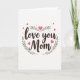 This card features the words “Love you Mom” centered in a flowing, hand-drawn style, colored in deep brown so it stands out gently against the page. A soft semicircle of olive-green leaves curves around the text like a quiet hug, adding a natural frame that feels caring and close. Rosy pink hearts in mixed sizes float inside and around the leafy arc, suggesting an affectionate bond ❤️. The background stays bright white, giving the muted greens, warm browns, and soft pinks plenty of breathing room. The lettering sits slightly above the midpoint, with the wreath rising from below and guiding your eye back toward the message. Light watercolor-like texture shows in the leaves and hearts, adding a tender, intimate look rather than a flat finish 🌼. Small hearts appear near the edges while a few larger hearts cluster closer to the center around the wreath.
