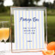 Whimsical mediterranean themed bridal shower mimosa bar sign featuring a soft and inviting color palette of buttercream and soft blue stripes. This tranquil backdrop is perfectly complemented by the fun dark blue handwritten font, creating a harmonious blend of colors.