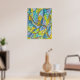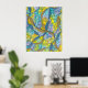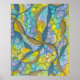 This poster is a vibrant and visually captivating piece of abstract art. It features a dynamic interplay of shapes, lines, and colors, creating a sense of movement and energy. The use of watercolor and ink gives the artwork a textured and organic feel. The artwork is dominated by a variety of swirling, circular shapes in shades of blue, purple and yellow. These shapes overlap and interweave, creating a sense of depth and complexity. Thin, curved lines in brown and black meander through the artwork, adding a sense of direction and movement. These lines also create a sense of structure and order amidst the swirling shapes.