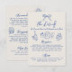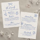 European-Inspired Blue and White Hand-Drawn Vintage Wedding Details Enclosure Card. This whimsical design features a hand-drawn bow and charming accents like a champagne glass, wedding rings, and a "Just Married" car, all on an off-white background. The playful layout combines handwritten script and a simple font, offering space for reception info, attire, accommodations, and more. Fully customizable, this card adds a personal touch to your wedding details.