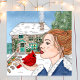 Hand drawn art. The first snow. A lady holding a cardinal on a snowy winter day in front of an English cottage.