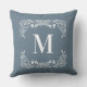 This monogram Christmas throw pillow features hand drawn white winter foliage that frames the monogram. The monogram appears in white on a dark dusty blue background.