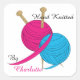 Cute stickers with a picture of two balls of knitting wool and wooden knitting needles poking through them. Ideal for all those craft people who love to knit with text reading Hand knitted by, and easy to customize with a personal name.