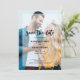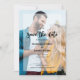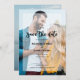 Double sided save the date with two full bleed portrait photos of the happy couple. The photo on the front is partially covered with a faux vellum style, translucent overlay and hand lettered with "save the date" in a bouncy brush script. The template is set up for you to customize with your names, wedding date and any additional information you wish to provide at this stage. The photo on the back of the card is in full color with no overlay.